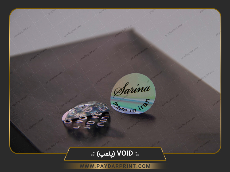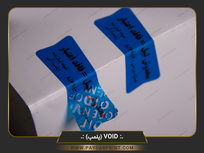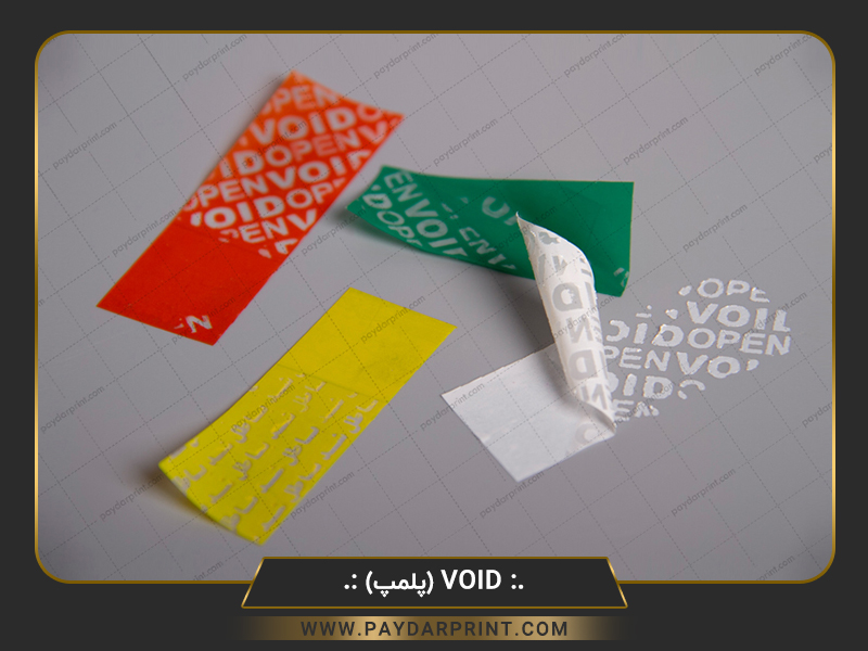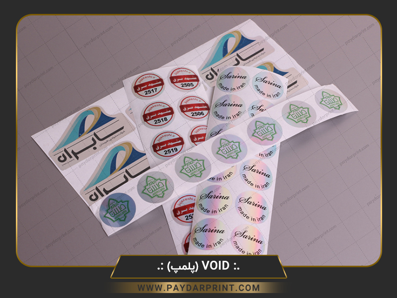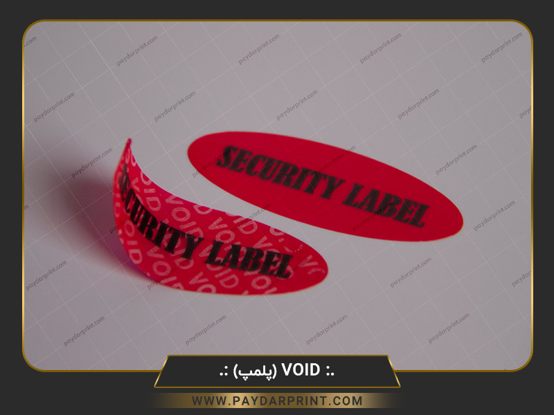 لیبل void بی اثر : هنگامی که لیبل به محصول چسبانده میشود ، زمان جدا کردن عبارات مختلف که عموما ( viod ، کنسل شد ، باطل شد ) به صورت جای خالی بر روی لیبل مشخص میشود ، بصورتی که لیبل حالت اولیه خود را از دست داده و نمی توان آن را بر سطح جدید الصاق نمود . چاپ این لیبل بدون محدودیت در طرح ، رنگ و نوع شکل برش ( بدون ساخت قالب ) با قابلیت درج همزمان شماره متغیر ، بارکد و اطلاعات متغیر میتوان در رنگ های مختلف ( قرمز / زرد / آبی / سفید / شفاف / نقره ای / طلایی ) تولید نمود و بدلیل داشتن خاصیت امنیتی بالا در مصارف پلمپ و گارانتی محصولات استفاده می گردد.